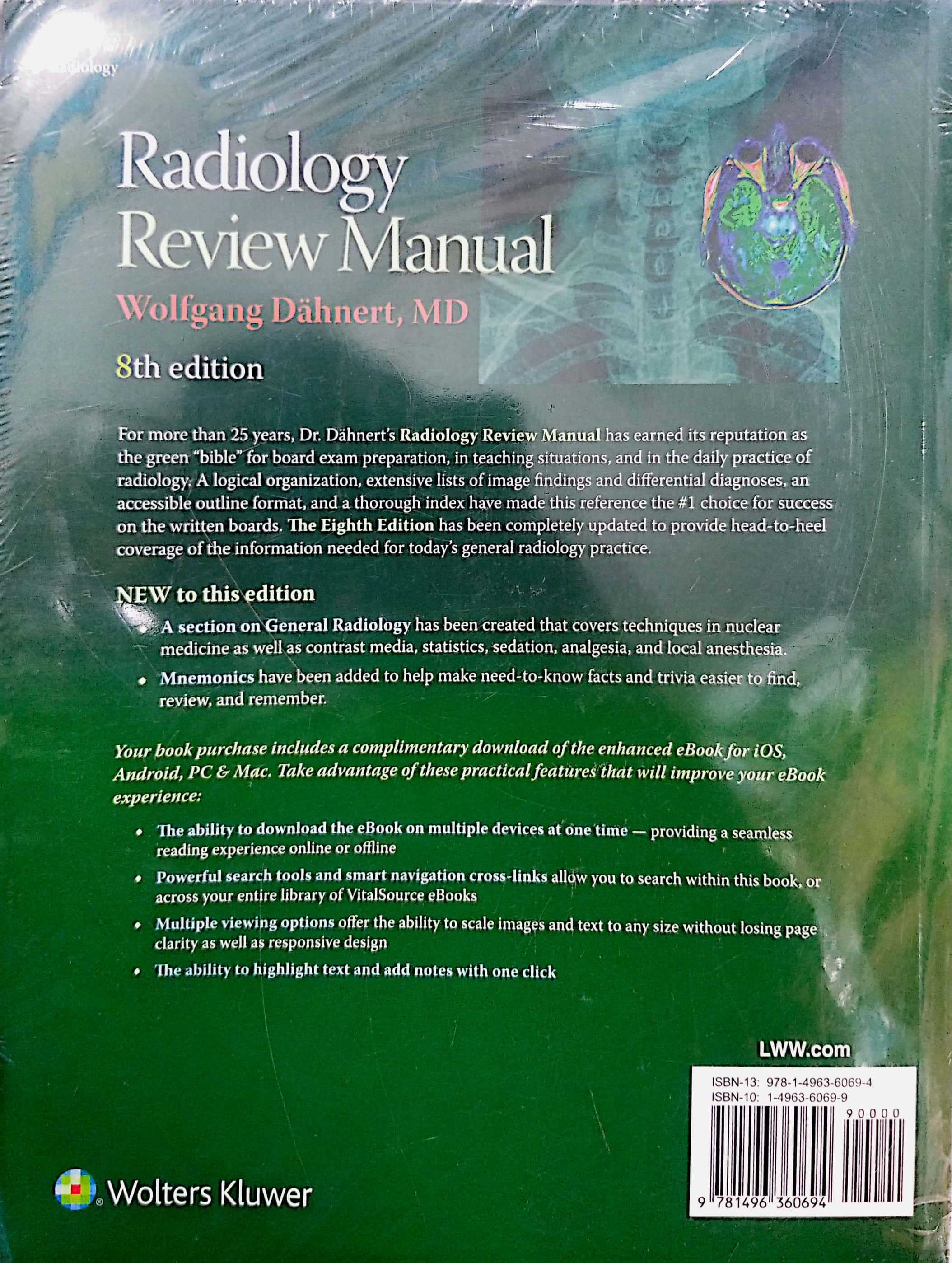 Radiology Review Manual Wolfgang Dähnert, MD 8th edition For more than 25 years, Dr. Dähnert's Radiology Review Manual has earned its reputation as the green "bible" for board exam preparation, in teaching situations, and in the daily practice of radiology, A logical organization, extensive lists of image findings and differential diagnoses, an accessible outline format, and a thorough index have made this reference the #l choice for success on the written boards. The Eighth Edition has been completely updated to provide head-to-heel coverage of the information needed for today's general radiology practice. NEW to this edition, A section on General Radiology has been created that covers techniques in nuclear medicine as well as contrast media, statistics, sedation, analgesia, and local anesthesia. Mnemonics have been added to help make need-to-know facts and trivia easier to find, review, and remember. Your book purchase includes a complimentary download of the enhanced eBook for i0S, Android, PC& Mac. Take advantage of these practical features that will improve your eBook experience. The ability to download the eßook on multiple devices at one time -providing a seamless reading experience online or offline Powerful search tools and smart navigation cross-links allow you to search within this book, or across your entire library of VitalSource eBooks. Multiple viewing options offer the ability to scale images and text to any size without losing page clarity as well as responsive design.