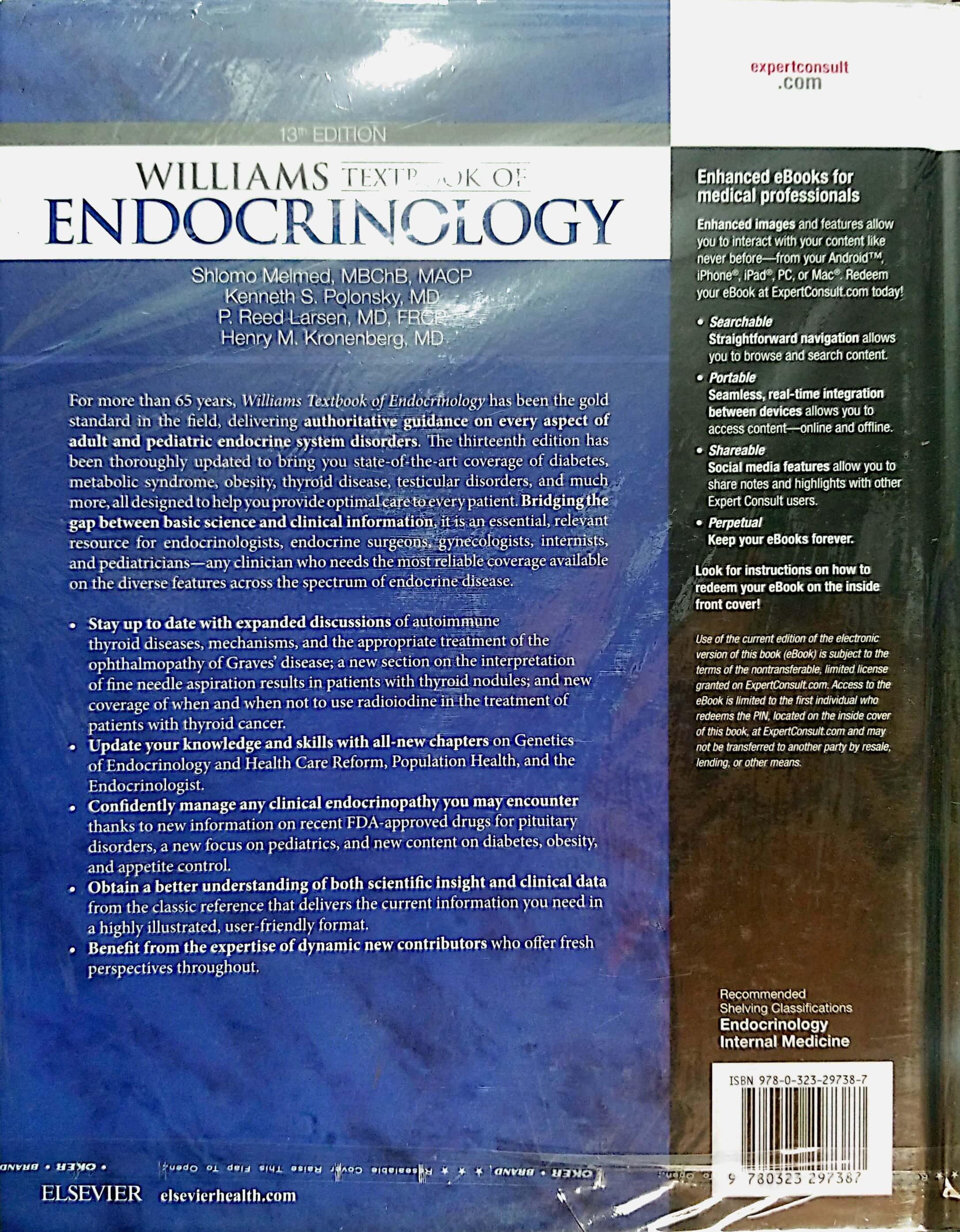 William's Textbook of Endocrinology For more than 65 years, Williams Textbook of Endocrinology has been the gold standard in the field, delivering authoritative guidance on every aspect of adult and pediatric endocrine system disorders. The thirteenth edition has been thoroughly updated to bring you state-of the-art coverage of diabetes, metabolic syndrome, obesity, thyroid disease, testicular disorders, and much more, all designed to help you provide optimal care to every patient. Bridging the gap between basic science and clinical information it is an essential, relevant resource for endocrinologists, endocrine surgeons gynecologists, internists, and pediatricians-any clinician who needs the most reliable coverage available on the diverse features across the spectrum of endocrine disease. Stay up to date with expanded discussions of autoimmune thyroid diseases, mechanisms, and the appropriate treatment of the ophthalmopathy of Graves disease; a new section on the interpretation of fine needle aspiration results in patients with thyroid nodules; and new coverage of when and when not to use radioiodine in the treatment of patients with thyroid cancer. Update your knowledge and skills with all-new chapters on Genetics of Endocrinology and Health Care Reform, Population Health, and the Endocrinologist. Confidently manage any clinical endocrinopathy you may encounter thanks to new information on recent FDA-approved drugs for pituitary disorders, a new focus on pediatrics, and new content on diabetes, obesity, and appetite control. Obtain a better understanding of both scientific insight and clinical data from the classic reference that delivers the current information you need in a highly illustrated, user-friendly format. Benefit from the expertise of dynamic new contributors who offer fresh perspectives throughout.